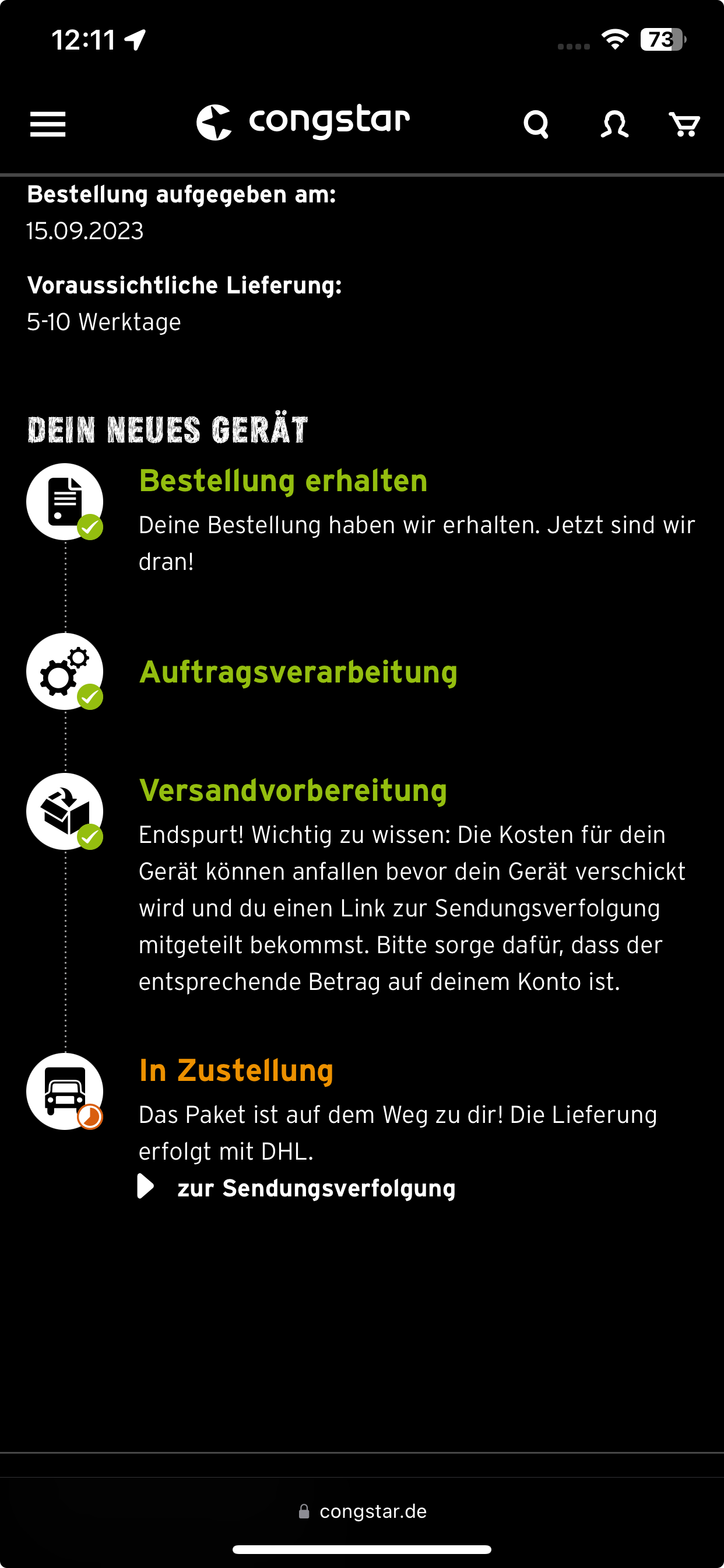 Bei mir stand auch erstmal Endspurt und jetzt steht leider das das Handy nicht auf Lager haben. Das Geld ist auch schon vorgemerkt für die Abbuchung.