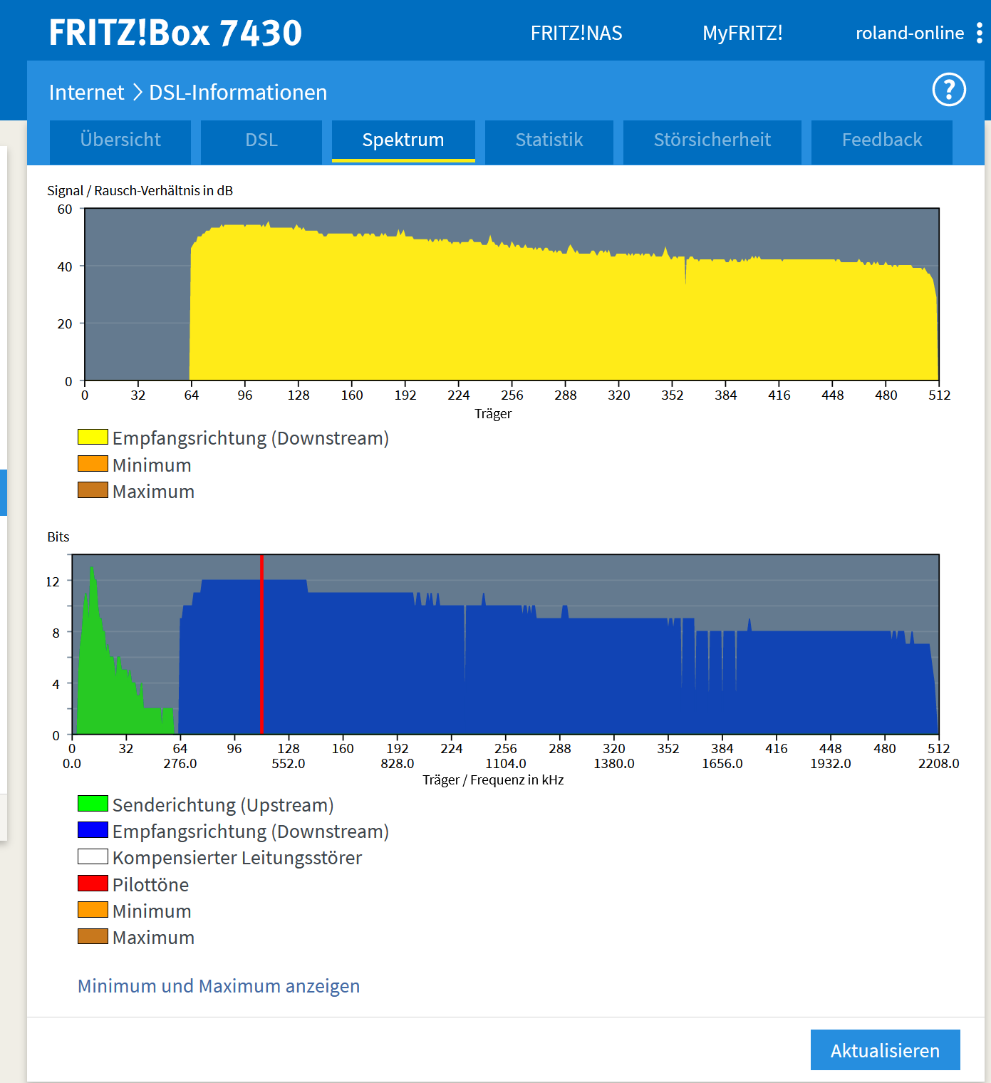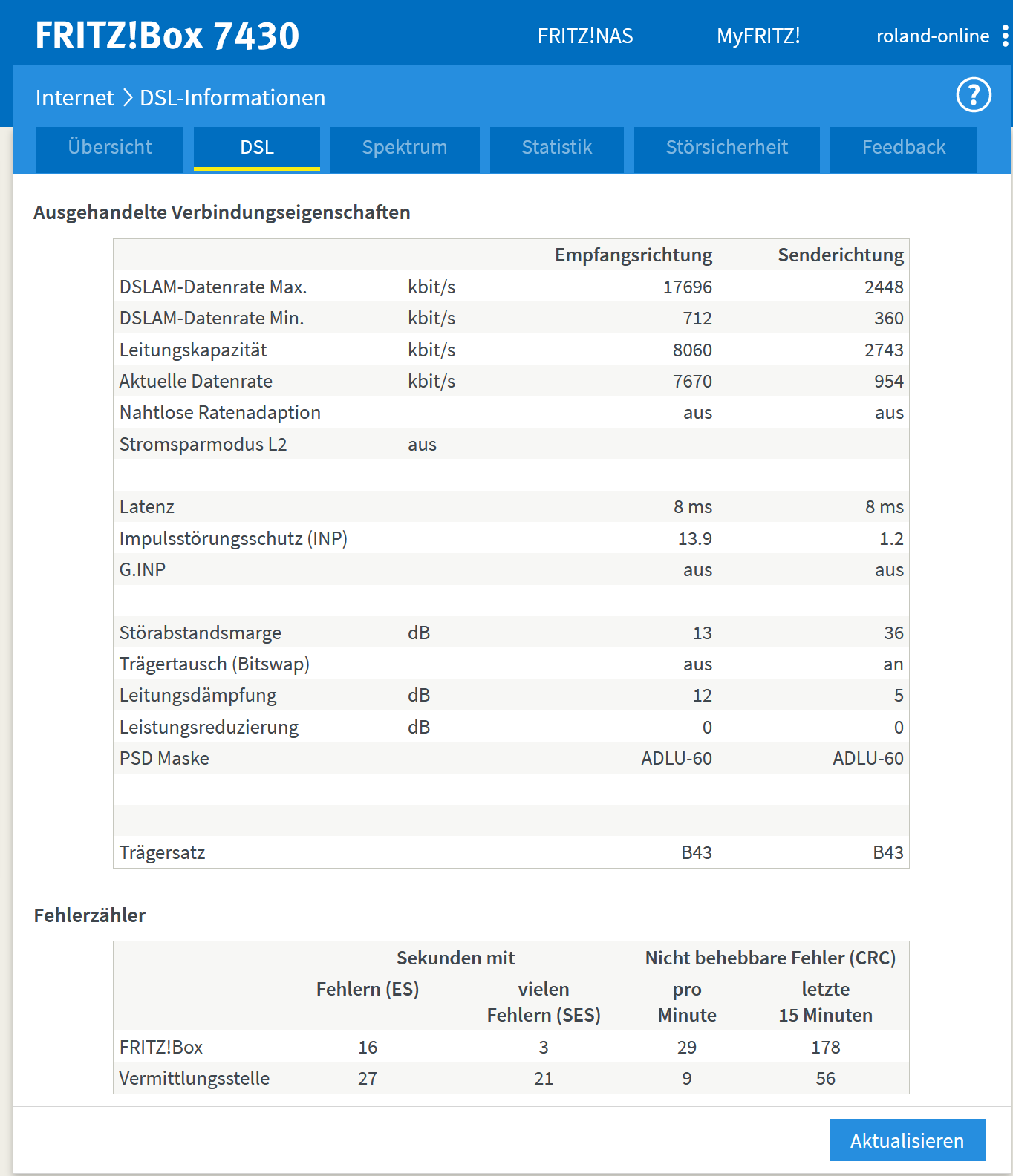 - Mein letzter Analyse-Stand vor Ort war eben, absolut instabile DSL-Verbindung bzw. in der FB-DSL-Übersicht (Bild 1) konnte man es wirklich rot/gelb/grün "blinken" sehen.