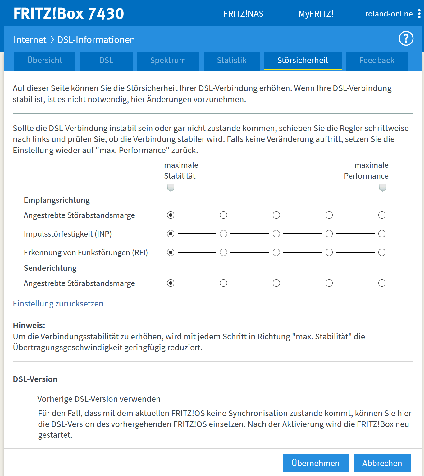 - Daraufhin habe ich mir die Push-Nachrichten in der Box aktiviert (bei Bedarf verfügbar) und zusätzlich dort etwas an der Störsicherheit (jetzt sind alle Schalter links) gedreht.
