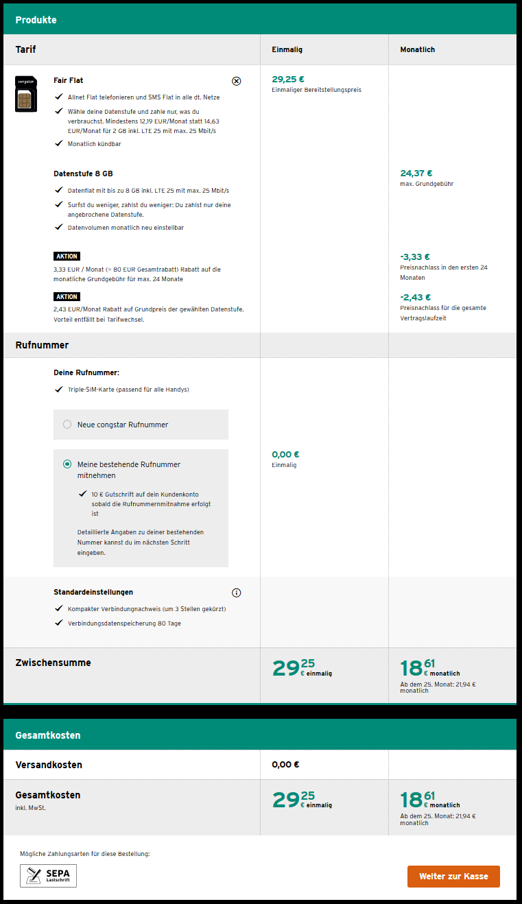 Ich habe einen neuen Vertrag (FairFlat 8GB) gebucht und dazu auch einen Gutschein (GMFAIR80) eingetragen.