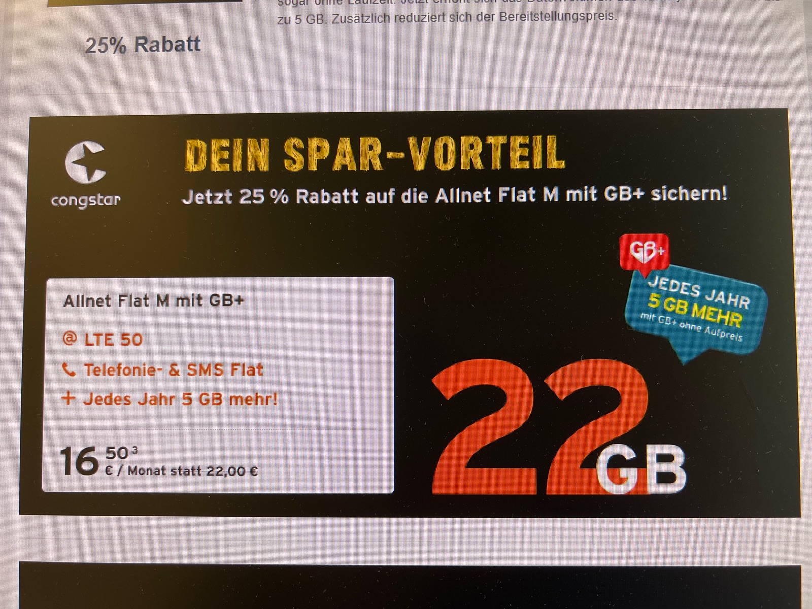 Guten Morgen, also von 22 € sind 25% aber 5,50€ und nicht 2€. Ich habe praktisch nur das Angebot bekommen, was mir sowieso schon vor dem CB Code angeboten wurde. Congstar hat auf der CB Website geworben, dass der Vertrag statt 22€ nur 16,50€ kostet und nicht 20€…
