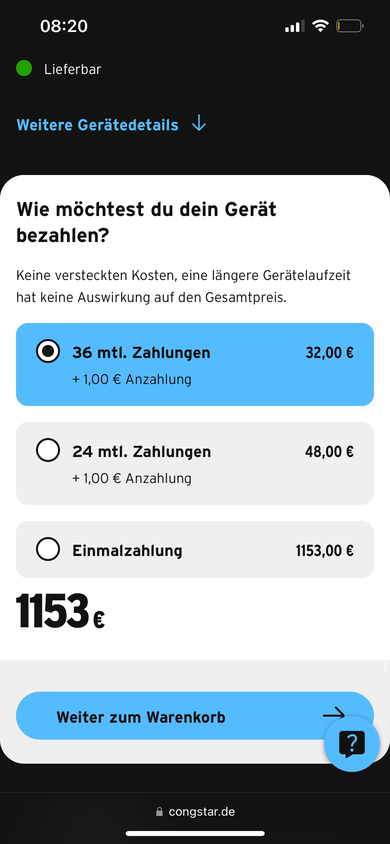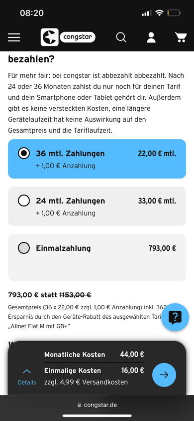 möchtest du das Google Pixel 9 Pro XL mit 36 Monatsraten? Wenn ja, sind es ingesamt mit dem Tarif 51,80 € monatlich und einmalig 41,99 € (37,00 € Anzahlung + 4,99€ Versandkosten). Wir müssten zu dem wissen ob die hinterlegte Adresse in deinem Kundenkonto noch passt, nicht das am Ende das Gerät nicht bei dir ankommt. Gib uns bitte Rückmeldung.