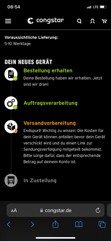 Jetzt hab ich mich schon gefreut, dass der Status auf "Endspurt!" aktualisiert wurde, jetzt kommt die Info, dass das Gerät nicht auf Lager ist... "Leider haben wir dein bestelltes Endgerät aktuell nicht auf Lager."