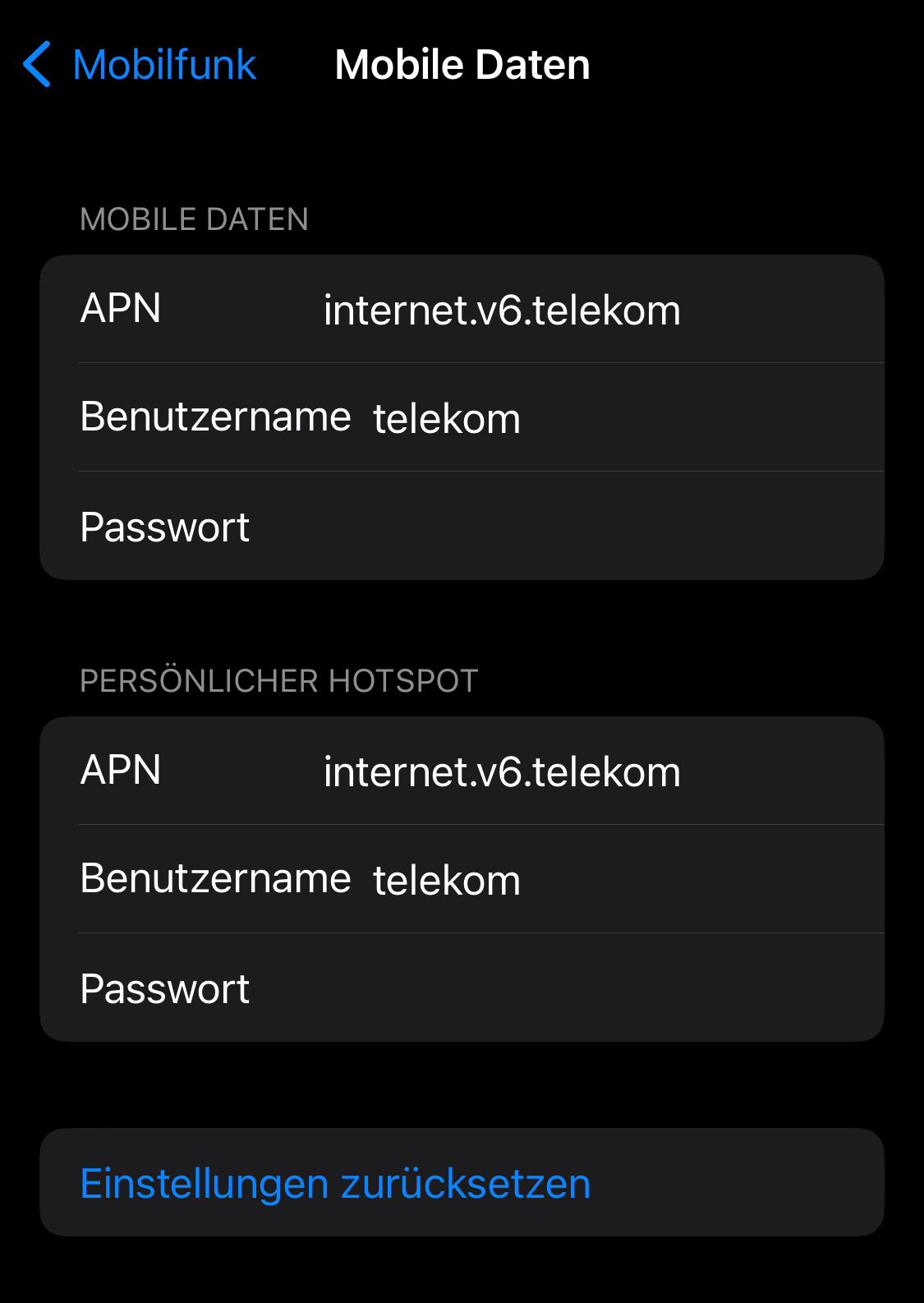 Wie oben beschrieben: Da stehen schon andere Daten (wenn auch erheblich weniger Eingabefelder, s. Screenshot👇). Sind die oder die von Dir genannten korrekt:ZitatAPN (auch Zugangspunkt genannt): internet.telekom