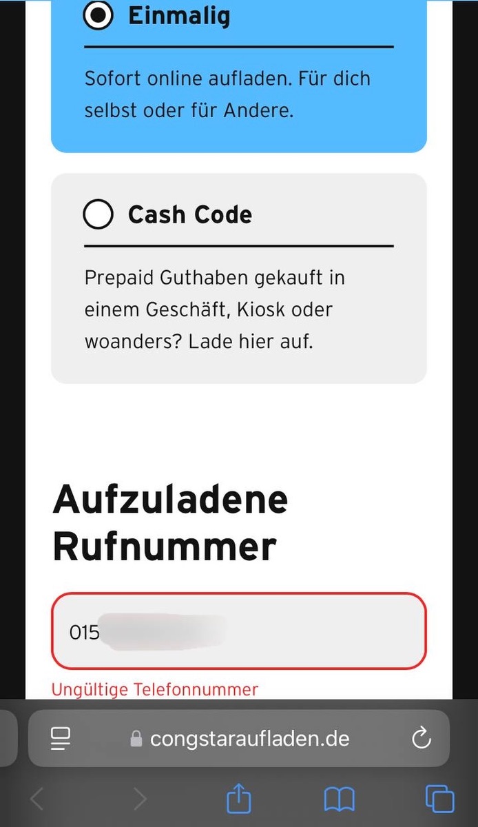 Ich habe die Nummer in sämtlichen Formaten eingegeben und allesamt werden als ungültig angezeigt. Auf eine Bezahlmethode werde ich gar nicht erst weitergeleitet. Nun könnte ich versuchen die Nummer per cashcode aufzuladen, allerdings habe ich Angst, dass es auch da Probleme geben könnte und dann das Geld weg ist. Außerdem hat es sonst ja auch immer funktioniert. Was kann ich machen?