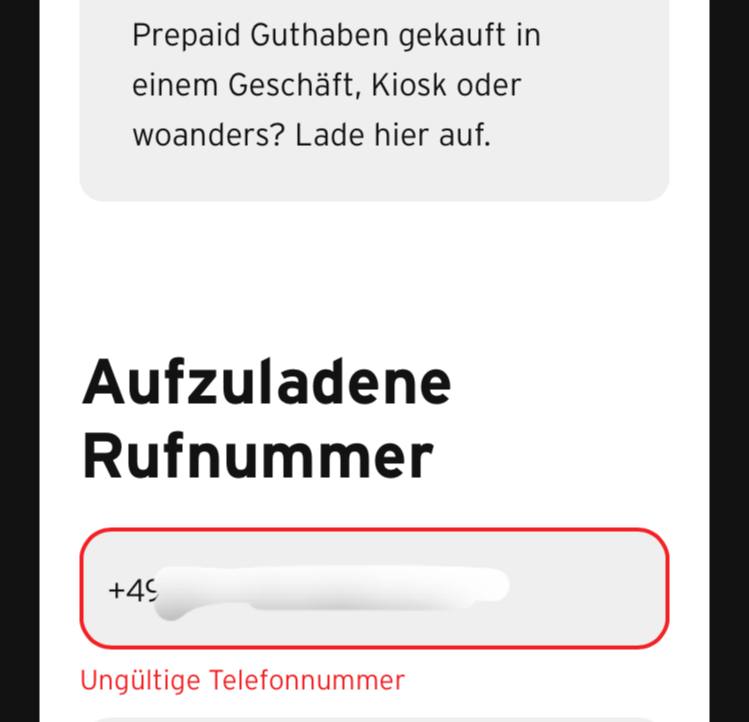 Ich habe einige Male innerhalb des letzen Monats versucht meine Prepaid aufzuladen, damit sich der Vertrag reibungslos verlängern kann. Dafür habe ich beides die Komfort und Automatische Option online ausprobiert. Auf die Website hab ich mit und ohne App zugegriffen und auch auf verschiedenen Geräten, jedoch wird meine Nummer immer als ungültig angezeigt.