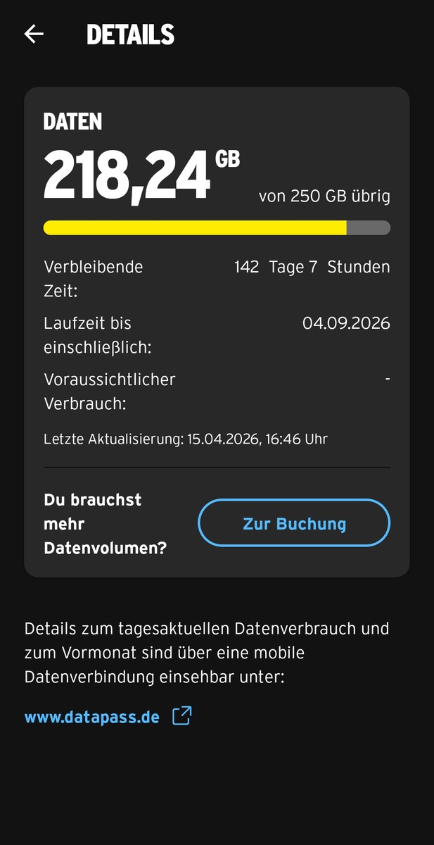 deine Angabe das ich schon über 390 GB verfügen sollte, deckt sich leider nicht mit der Anzeige in der Congstar App dort werden nur 250 GB angezeigt, siehe Anhang. Oder werden die 390 GB erst nach der nächsten Aufladung aktiv?