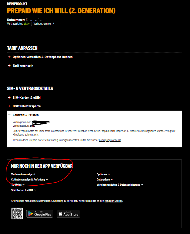 Ich möchte fast vermuten, dass das mit der Abschaltung der Website zu tun hat. Ich bekomme im MeinCongstar Bereich auf der Website gar nicht mehr die Möglichkeit die Aufladung vorzunehmen. Dort sieht es bei mir nämlich so aus: