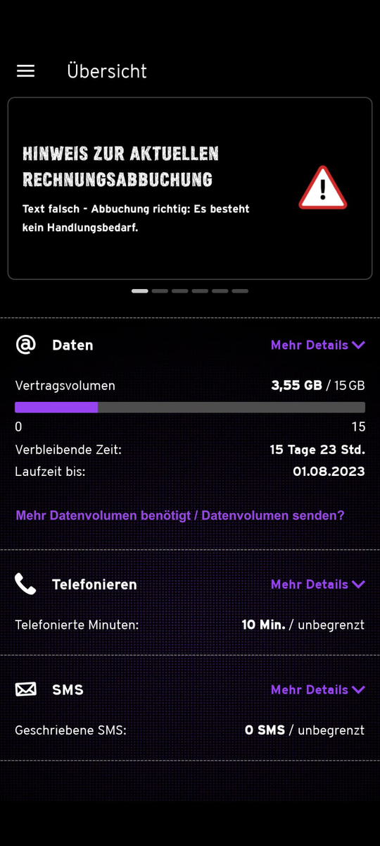 Daraufhin erhält der Beschenkte eine Nachricht, dass er nun bis zum Ende seines aktuellen Abrechnungszeitraums 3 GB zusätzlich zur Verfügung hat. Und auch unter meiner eigenen Nummer wird die entsprechend belastete Datenmenge bis zum Ende meines aktuellen Abrechnungszeitraums bereits angerechnet angezeigt.