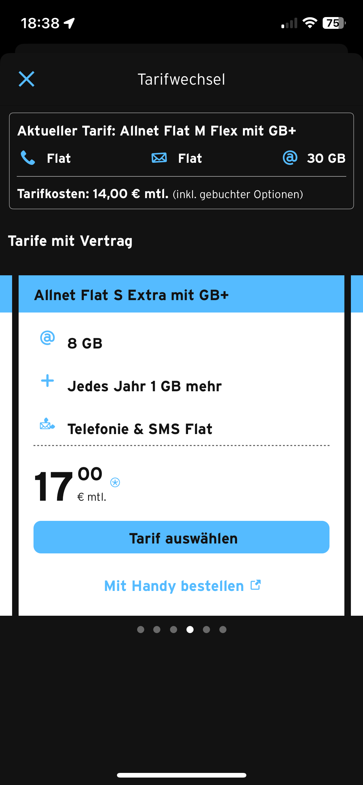 Zum Screenshot der Tarifwechsel-Oberfläche in der App sei gesagt: Ich nutze das (immer noch aktuelle) Partnerkarten-Angebot mit 30 GB für 11 € plus 5G-Option für 3 € - so erklärt sich die Tarifzusammenfassung oben. Unten bin ich beispielhaft zu einem Tarif gescrollt, der deutlich anders kalkuliert ist.