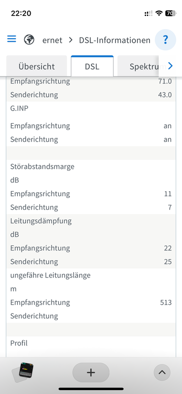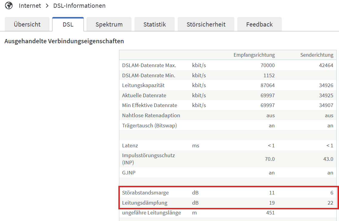 entscheidende Kriterien sind die Leitungsdämpfung und die Störabstandsmarge, die u.a., aber nicht nur von der Leitungslänge beeinflusst werden. Ja, diese Werte werden vom Router nur geschätzt, sind aber ein guter Anhaltspunkt. Die exakten Werte erfährst Du von Deinem Netzbetreiber. Wie hoch sind die Werte bei Dir? In der FB findest Du diese unter Internet → DSL-Informationen auf der Registerkarte DSL: