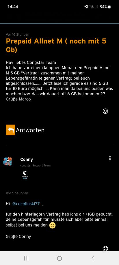 mein Lebensgefährte hatte sich gestern bei euch gemeldet bezüglich der dauerhaften 6 GB für 10 Euro im Monat (cocolinski77) Ich habe den "Vertrag" Prepaid Allnet M 5 GB und würde mich freuen, wenn man es auch auf 6 GB dauerhaft aufstocken könnte zum gleichen Preis.