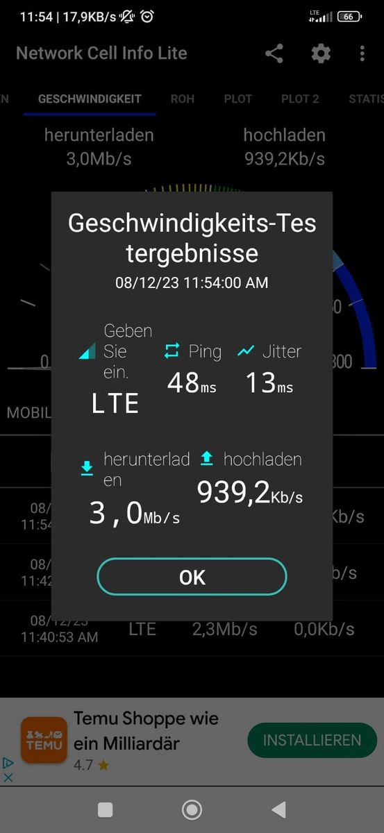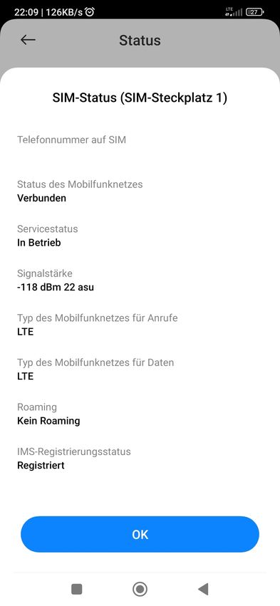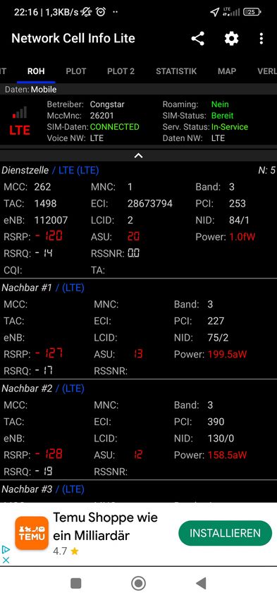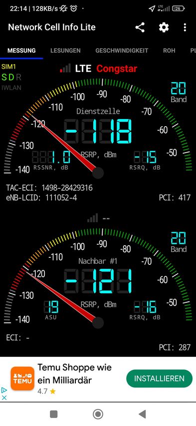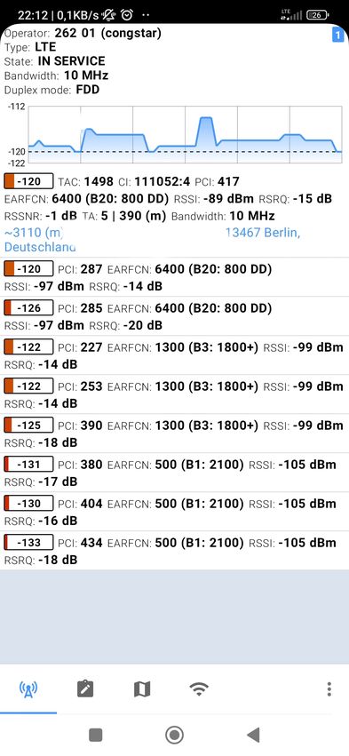 Sehr langsames mobiles Internet. 1-2 Signalstriche, sehr schlechte Signalstärke (siehe Screenshots mit -118 dbm) und sehr niedriger Down- und Uploadrate (siehe angehangenen Screenshot).