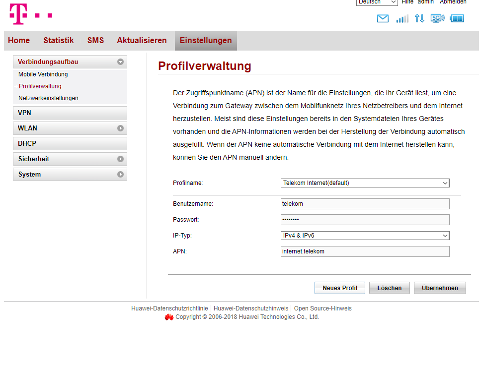 Also SIM rein und dann über WLAN auf den Router zugegriffen, sieht ähnlich aus wie da: 3 oder 4 grüne Balken und LTE darunter, nur Telekom.de steht nicht drüber. Nur eben kein Internetzugang. Also rein in die Einstellungen und zur Profilverwaltung (der Screenshot ist jetzt von den Einstellungen mit Telekom Sim, ist nur dran damit man sieht welche Eingabemöglichkeiten hier vorhanden sind). Hier habe ein neues Profil angelegt und folgende Varianten probiert: