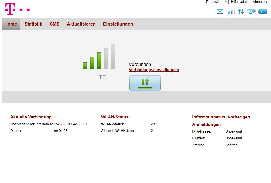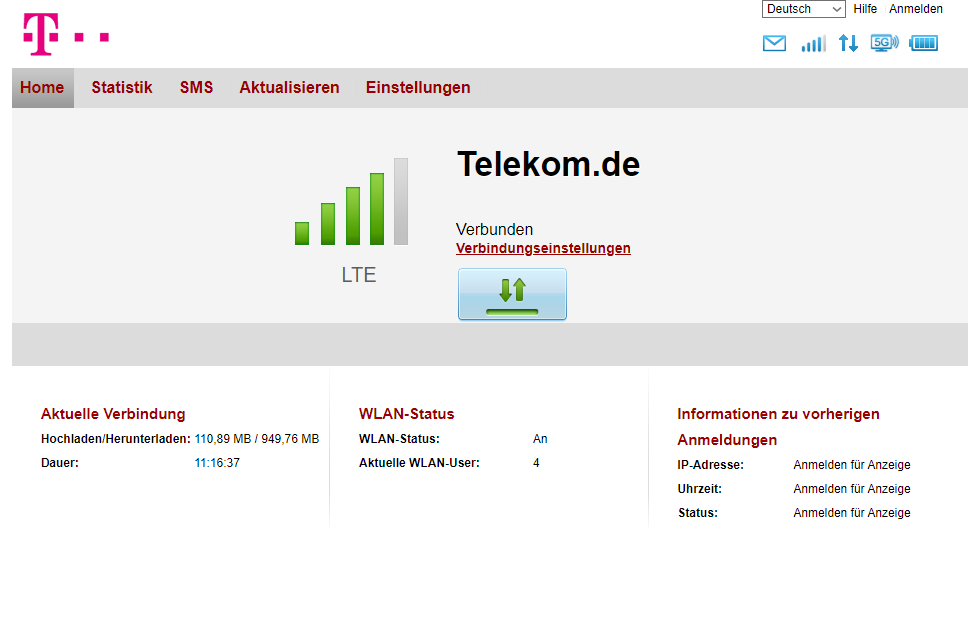 Angehängt nochmal ist Zustand mit Telekom SIM im Router. (so sah es mit der anderen SIM im Prinzip auch aus, nur das nicht Telekom.de drüber stand...