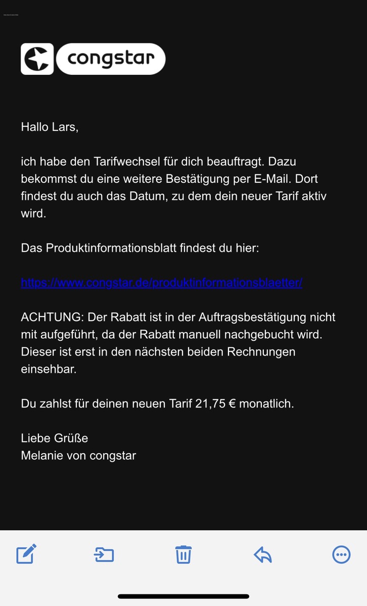 So nun wurde der Preis zum neuen Tarif in der App aktualisiert. Jedoch steht dort nun ein Preis von monatlich 23,20 Euro und in der schriftlichen Bestätigung, 21,75 Euro monatlich. Zu letzteren Konditionen hab ich den Tarif auch umgestellt. Das war das Maiangebot CB 25%. Ich glaube es wurde nur der CB zu 20% berücksichtigt