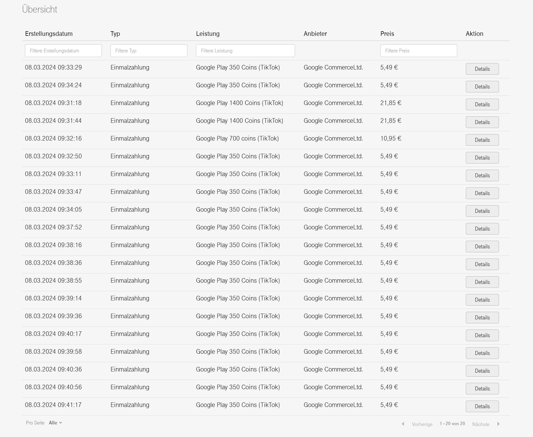 Beim Einloggen über die Seite "https://cap.telekom.de", welche in den SMS der Telekom genannt wird, sieht man dann, dass anscheinend irgendwelche "TikTok-Coins" für insgesamt 147,98€ über "Google Play" gekauft wurden:
