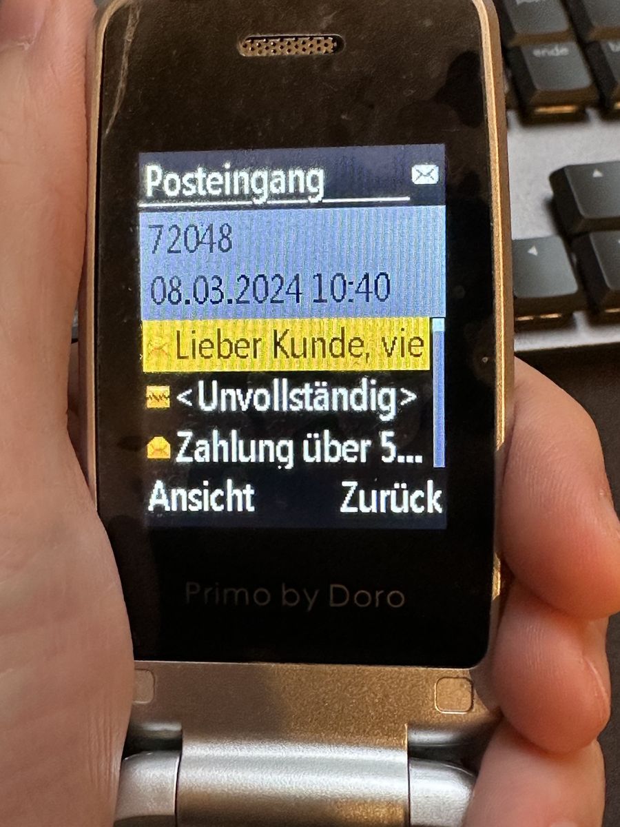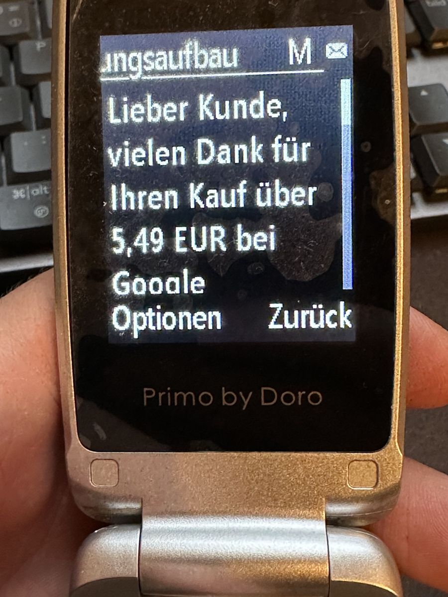 Am Freitag, 08.03.2023, hat gegen 9:30 Uhr plötzlich ständig ihr Handy vibriert, da - wie sich später herausstellte - ständig SMS von der Telekom und von der Nummer 72048 (von Google oder auch Telekom?) eintrudelten, in denen Käufe per Handyrechnung bei "Google Commerce Ltd." verkündet wurden. Sie bat mich panisch um Hilfe, da sie nur ein einfaches Doro Primo 405 besitzt ("Seniorenhandy", darauf läuft kein Android), mit welchem man nur telefonieren und SMS schreiben kann, wobei sie nur ersteres macht (ist eher ein "Notfall-Handy").