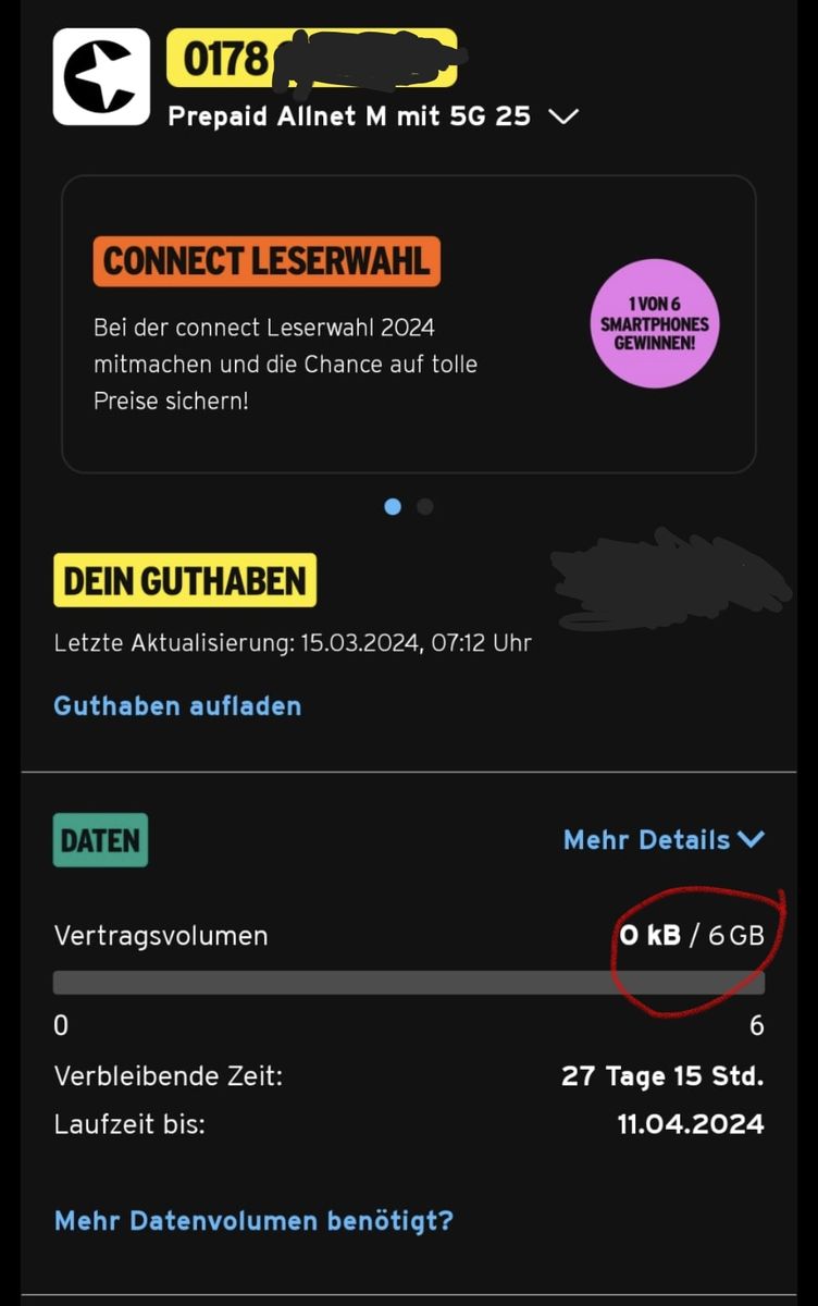 Das Datenvolumen ist noch immer 6GB