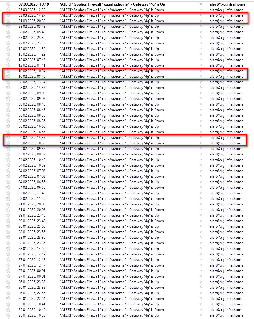 Am 25.01. habe ich den "Ersatzrouter" wieder in Betrieb genommen und man sieht die immer wieder abbrechenden Verbindungen, bei den Markierten musste ich manuell die Verbindung wieder herstellen. Seit dem 07.03. steckt jetzt die Vodafone SIM im Router und es gab keinen einzigen Ausfall mehr. Kann das an meiner Funkzelle liegen, ich hatte mir die Partnerkarte jetzt extra für den Zweck bestellt um den Router als Notlösung für einen Ausfall der Interverbindung zu haben. Aber ich möchte nicht ständig
