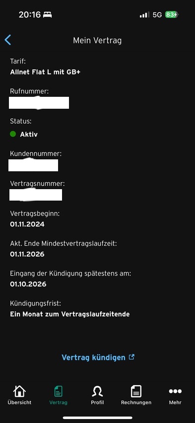 Bin seit dem 14.10. Kunde mit einer Partnerkarte. Soweit so gut, werd wohl auch bei den geilen Konditionen immer bei euch bleiben, ABER: ich liebe meine Flexibilität, auch bei Verträgen. Deswegen hab ich damals bei der Buchung eben monatlich kündbar gewählt UND auch bestätigt bekommen. Habe in der kurzen Zeit 2x den Tarif gewechselt, einmal als ihr in der App den Wechsel easy gemacht habt, da war ich bei gleichen Preis mal eben 20GB Daten reicher, nice! Und danke dafür.