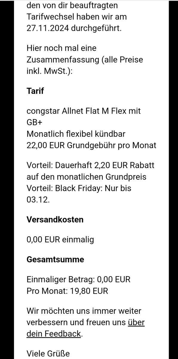 aus den Teilnahmebedingungen geht hervor, dass der „congstar for friends“ Vorteil bei einem Tarifwechsel entfällt. Eine nachträgliche Buchung ist technisch leider nicht mehr möglich :-("Zweite Mail: