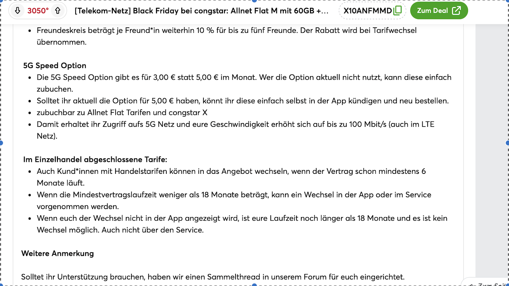 - Aktueller Vertrag ist aus dem Blackfriday Deal von 2023 (44 GB für 22€), dieser ist im Dezember 2023 über den Händler Starmobile zustande gekommen. Auf der Seite Mydealz hat Congstarhilft geschrieben, dass ein Wechsel möglich ist, wenn der Vertrag länger als 6 Monate schon läuft, aber weniger als 18 Monate noch hat.