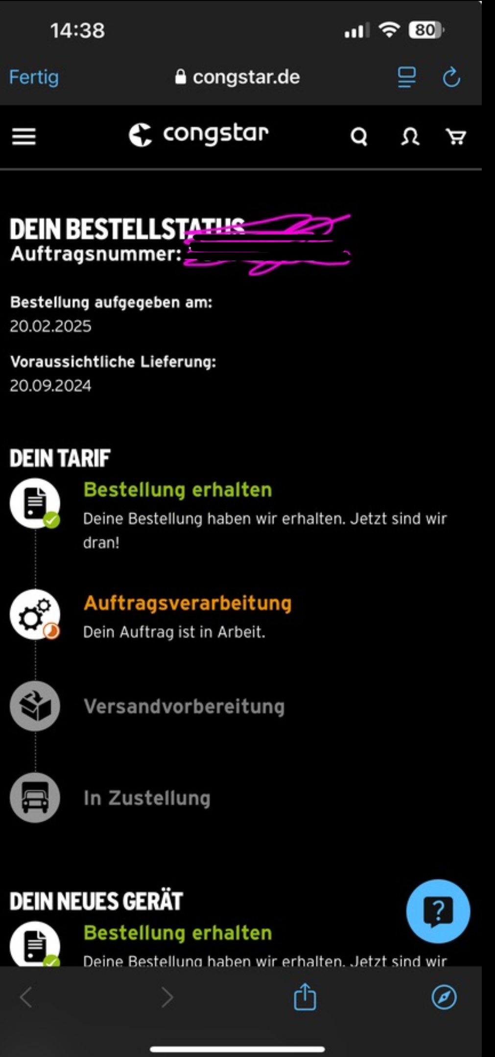 seitdem verändert sich der Status nicht von Auftragsverarbeitung nicht. Dann steht da voraussichtliche Lieferung 20.09.2024?????