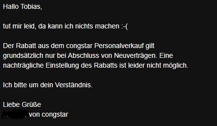 ich bin seit Jahren congstar-Kunde und wollte meinen Vertrag mit einem Corporate Benefits Code optimieren. Vom Support kam nur eine knappe Absage – ohne für mich nachvollziehbare Begründung denn grundsätzlich scheint es Kunden zu geben die Ihren Vertrag optimieren können.