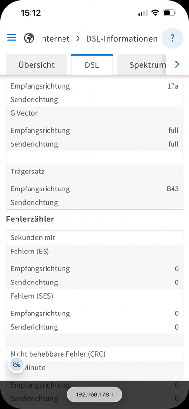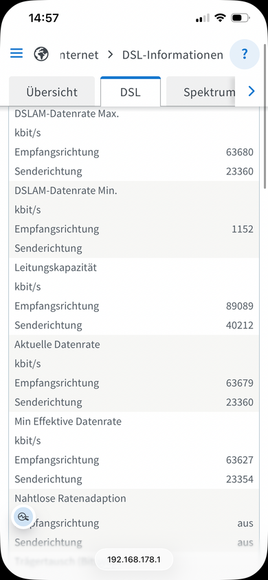 Genauso sah es bis Sonntag 3:35 Uhr aus, aber 89/37 Sync, SNR 7 und 0 Fehler. Dann wurde die Leitung getrennt, und mit den VDSL50 Werten gesynct. Ich bin mir jetzt schon sicher, dass der Techniker hier nichts finden wird. Und die Werte, die ich jetzt habe, sind exakt die gleichen wie zuvor bei der Telekom VDSL50.