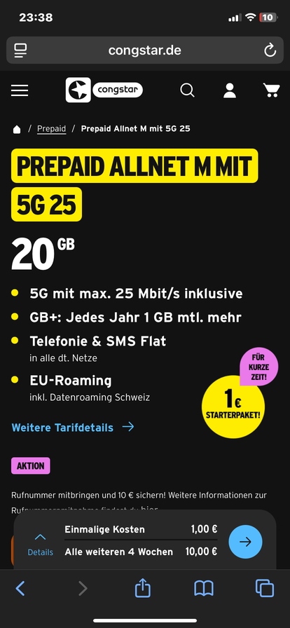 Ich bin mit allen Konditionen des Prepaid Allnet M einverstanden (20 GB, 5G mit bis zu 25 Mbit/s, 10 € alle 4 Wochen, GB+ etc.).Vielen Dank für eure Hilfe!
