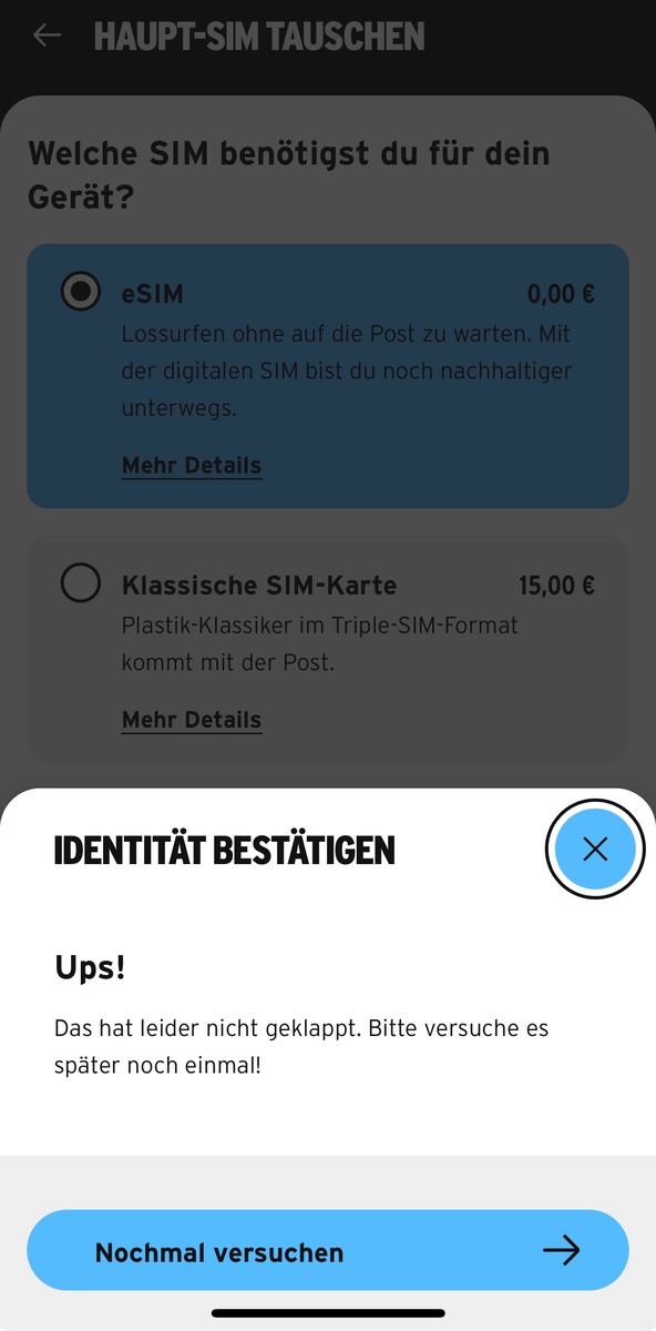 Identität bestätigen: Ups! Das hat leider nicht geklappt. Bitte versuche es später noch einmal!