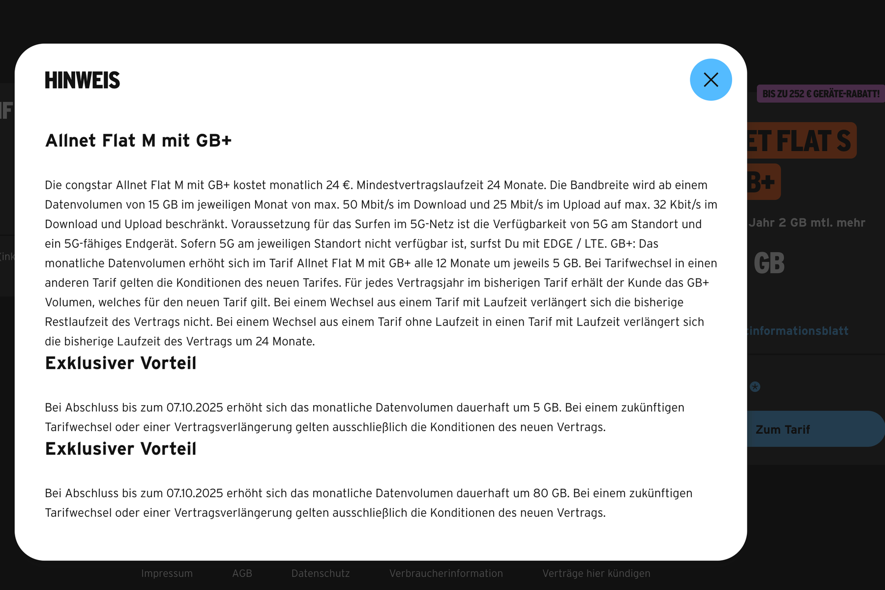 mir ist aufgefallen, dass es in den Allnet Flat GB+ Tarifen (XS bis XXL) unterschiedliche Angaben zur Drosselung gibt – je nachdem, wo man nachschaut, z. B. congstar Allnet Flat M mit GB+: