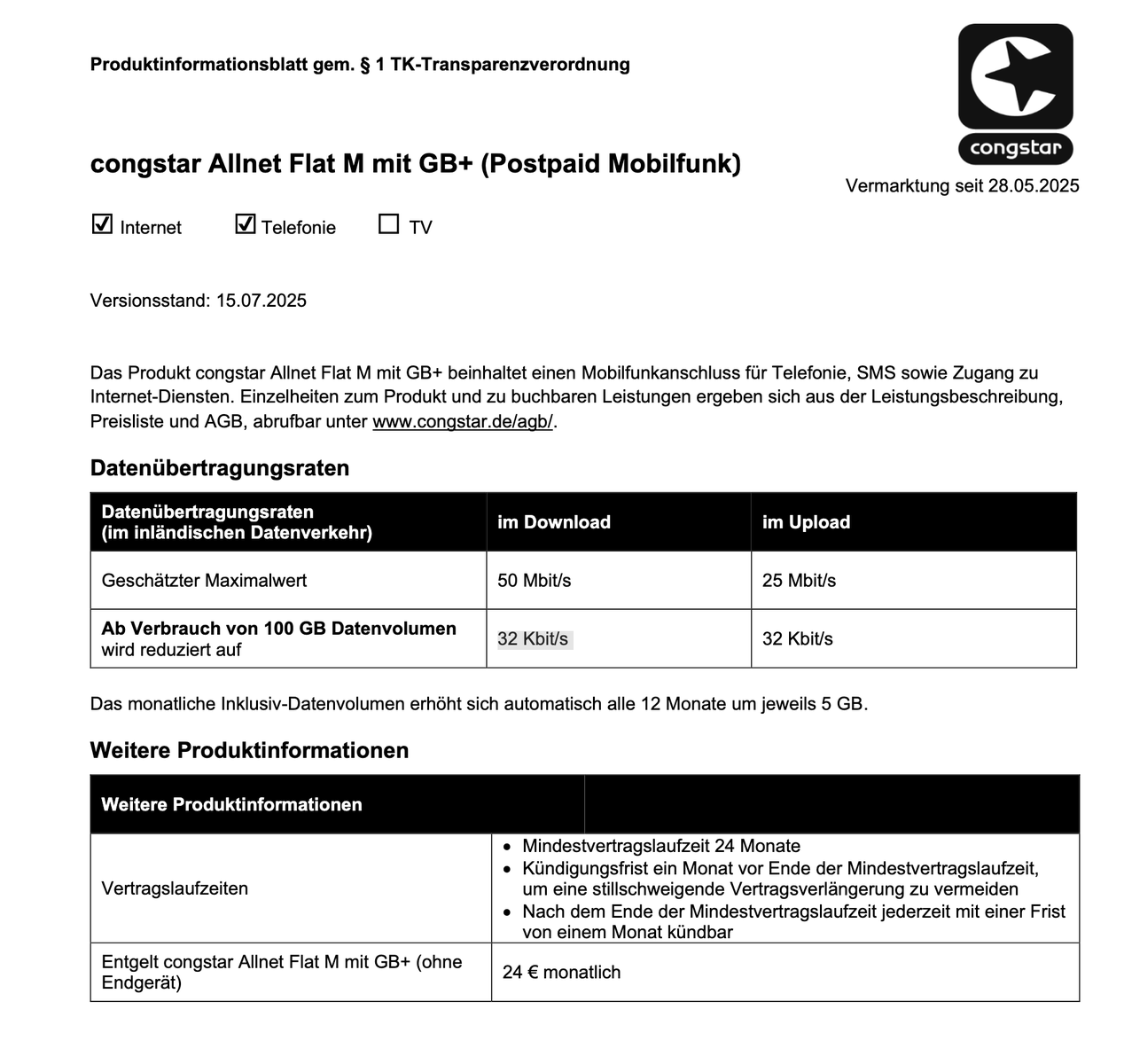 • Im Produktinformationsblatt finden sich abweichende Angaben : Ab Verbrauch von 100 GB Datenvolumen wird reduziert auf 32 Kbit/s