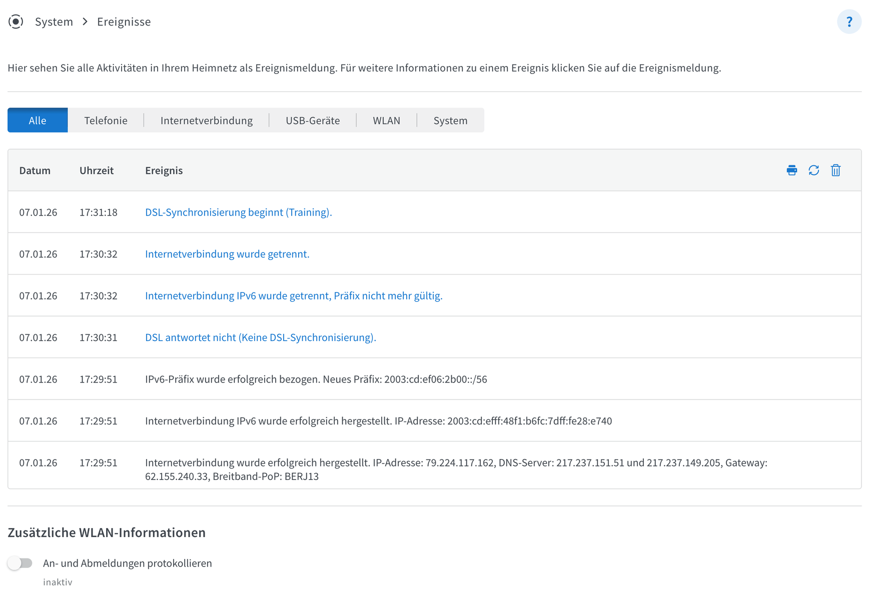 Im Ereignisprotokoll der FRITZ!Box finden sich wiederholt folgende Einträge: