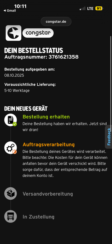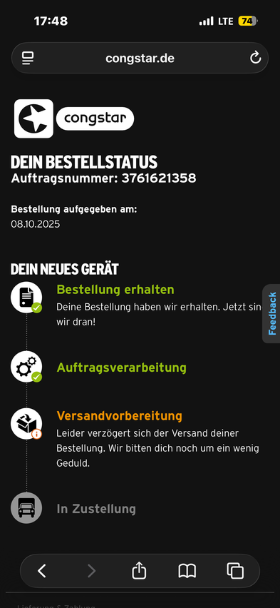 Wann kann ich ungefähr mit meiner Lieferung rechnen? Habe letzte Woche bestellt abgebucht wurde die Anzahlung bereits auch(Iphone 17 Pro 256GB Orange)