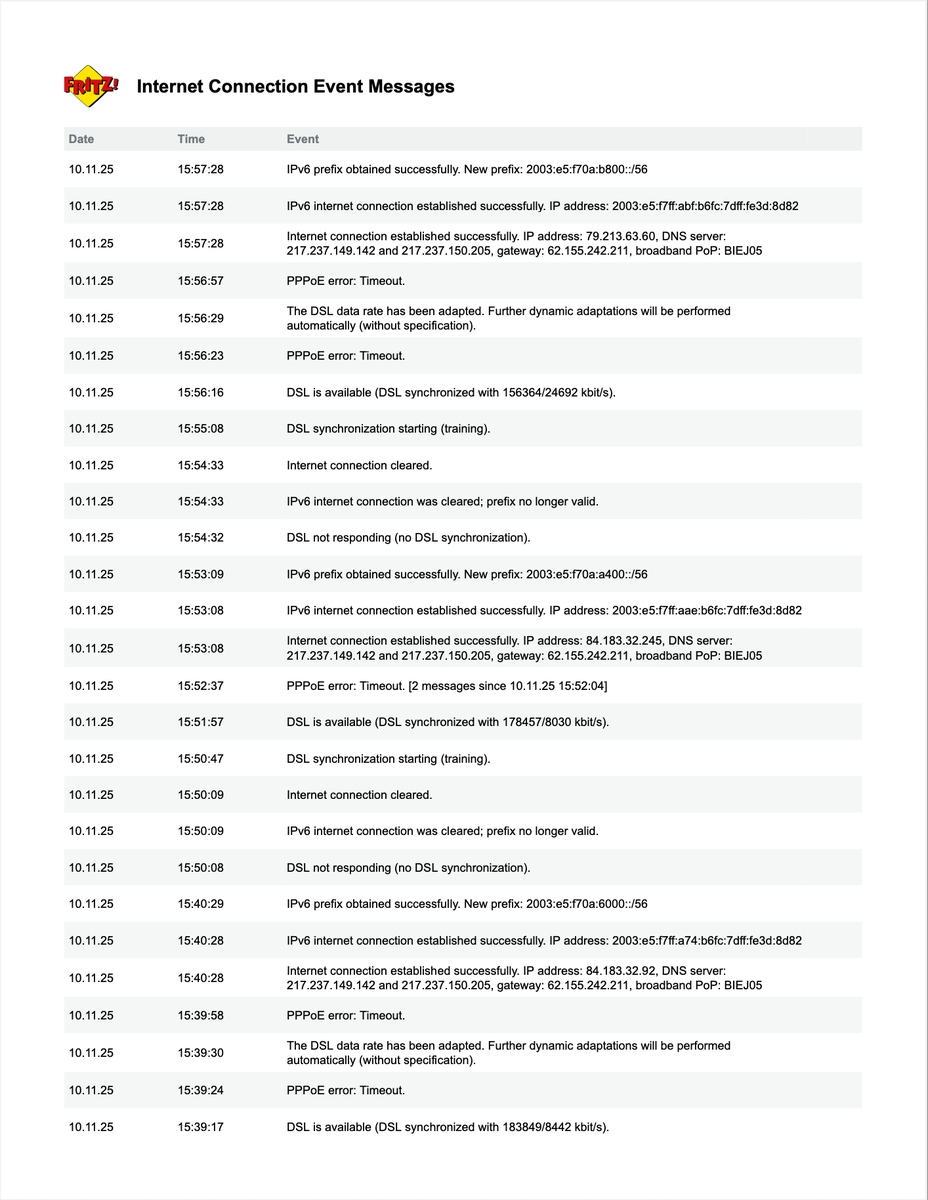 Hi Anja yes, a technician from Tekelom has checked out the connection today. Unfortunately there was no good resolution. He mentioned that the connection from the outside wallbox to my apartment is done with cheap wiring which prone to weather changes / moisture. He couldn't find any other issues. Since this wiring is under landlords ownership, there isn't much Telekom can do here.