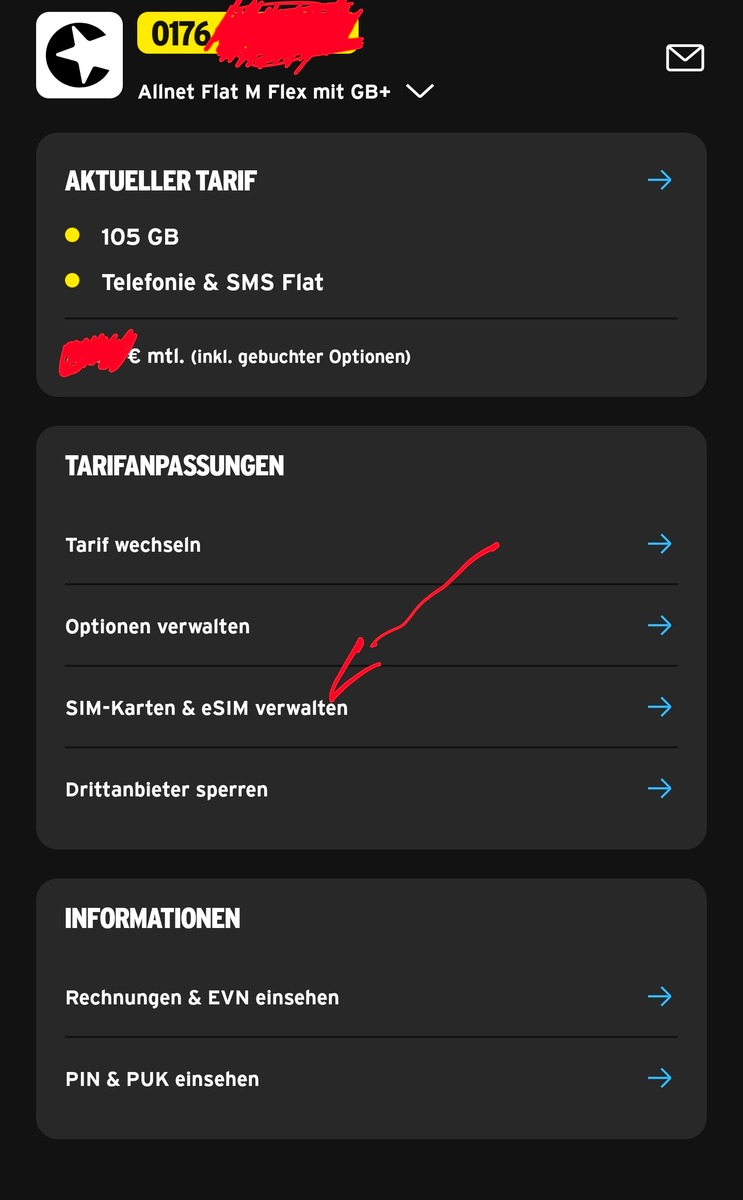 Ich habe die neueste Version der App, habe mich aus dem System abgemeldet und wieder angemeldet. Es ist immer noch dasselbe. Absurd. Außerdem habe ich auch keine Option, eine eSIM zu bestellen.