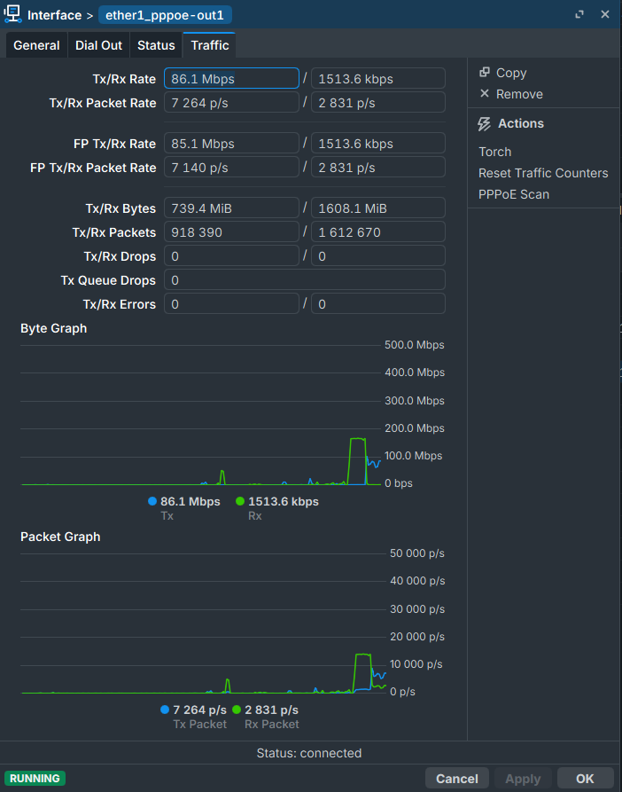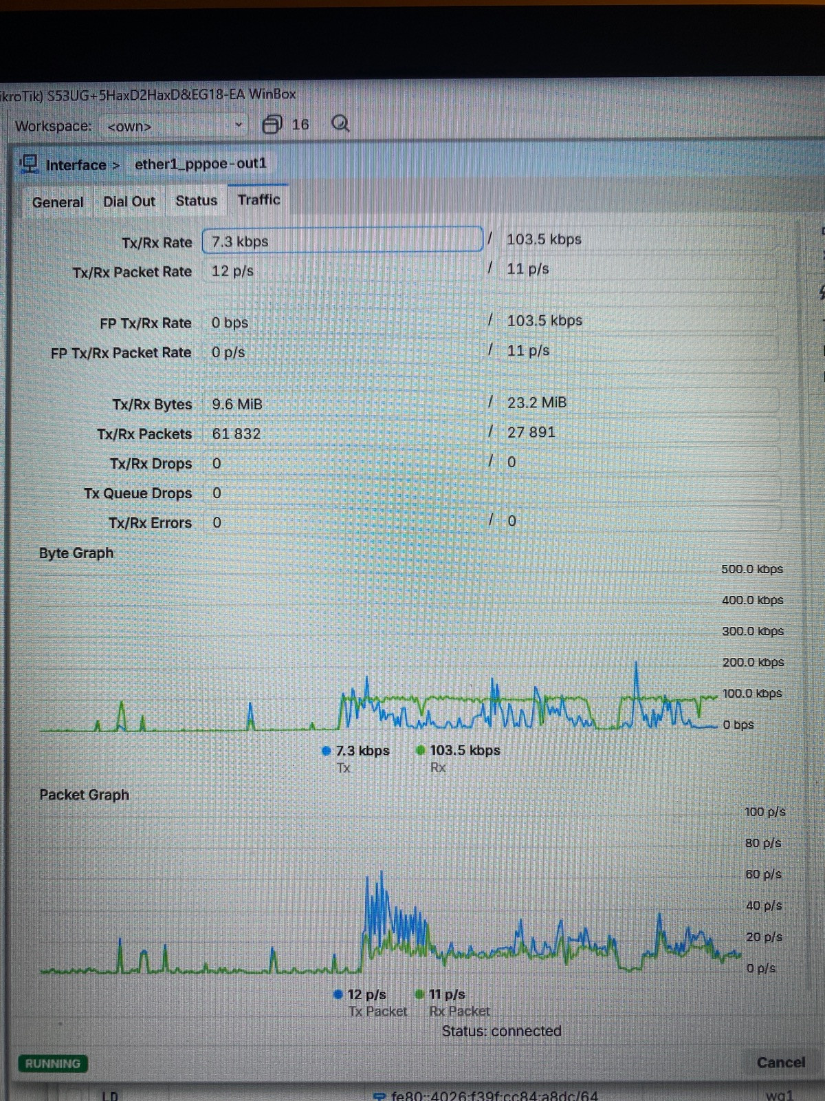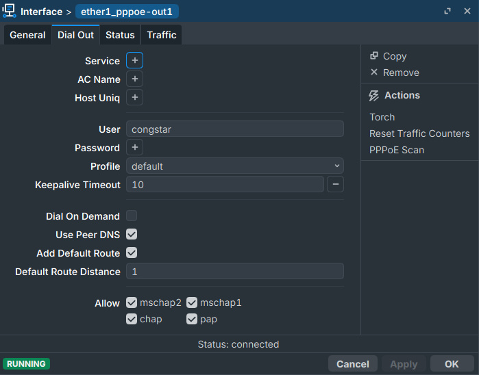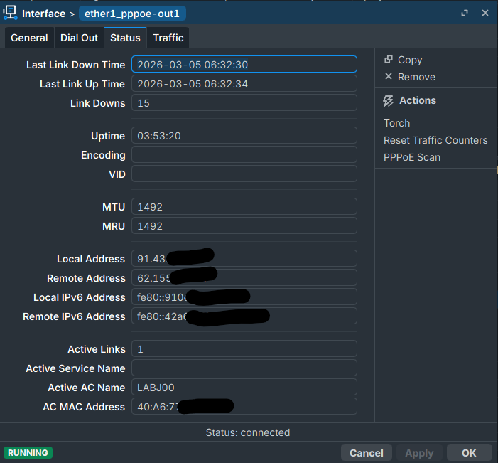 Bei meinem Mikrotik kommt die IPv4 direkt vom PPPOE client. Die IPv6 musste ich mir über DHCP client auf dem PPPOE interface holen.