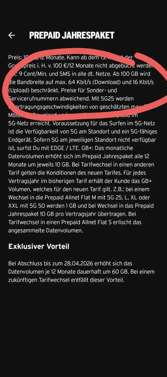 Dort steht bei mir beim Jahrespaket weiterhin: „Ab 100 GB wird die Bandbreite auf max. 64 Kbit/s (Download) und 16 Kbit/s (Upload) beschränkt.“