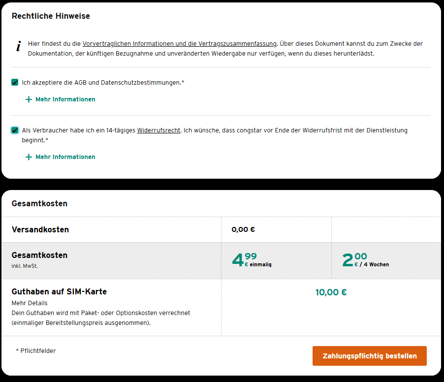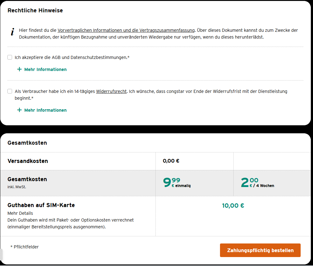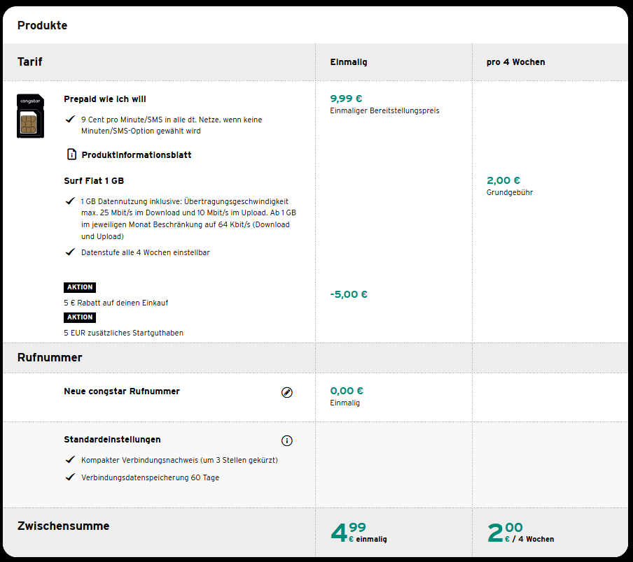 Ja so sehe ich das auch. Am Ende sollten 10 € Startguthaben (werden so im Screenshot angezeigt) auf der Karte sein nach Aktivierung der SIM so wie ich das verstehe (die 5€ Rabatt + 5€ Starguthaben aus der Aktion). Somit kommt man auf 0,01 € kosten für das Paket.