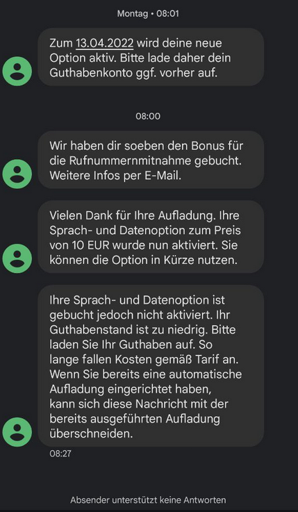 Es hätte ja auch sein können, dass umgekehrt morgen die 12 € für das 25 GB-Paket und dann nach 2 Tagen die 12 € für das 30GB-Paket abgebucht werden und ich das erste Paket nur 2 Tage nutzen konnte. Deshalb leite ich den Wechsel immer am letzten Tag des alten 4-Wochen-Zeitraums einleite, damit möglichst der alte Zeitraum noch voll ausgeschöpft wird.