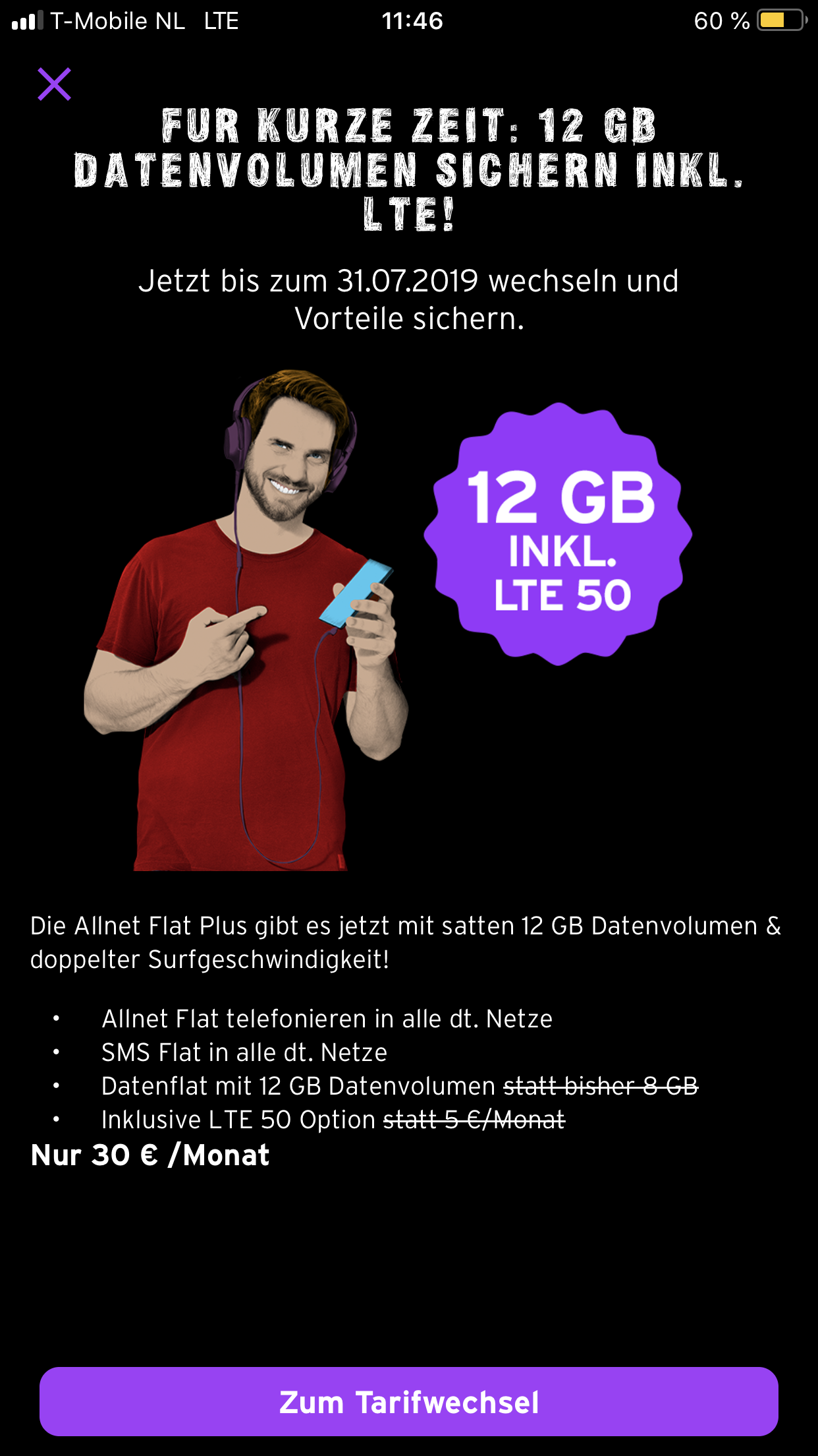 Ich war bereits im congstar Allnet Flat M mit GB+ Tarif (mit 44 GB / 60 GB zzgl. 5 GB Upgrade wegen 1 Jahr Laufzeit).