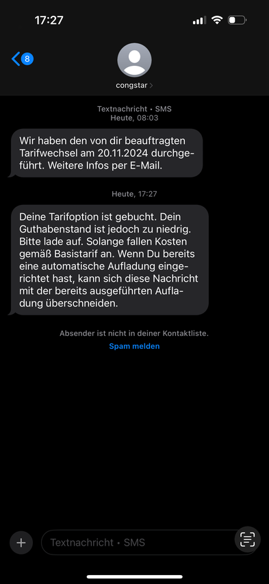 Jetzt hat eine der Nummern aber eine Nachricht bekommen, dass das Guthaben nicht ausreicht und deswegen Gebühren gemäß Tarif anfallen. Das kann aber eigentlich gar nicht sein, denn der Tarif ist ja aktiv.