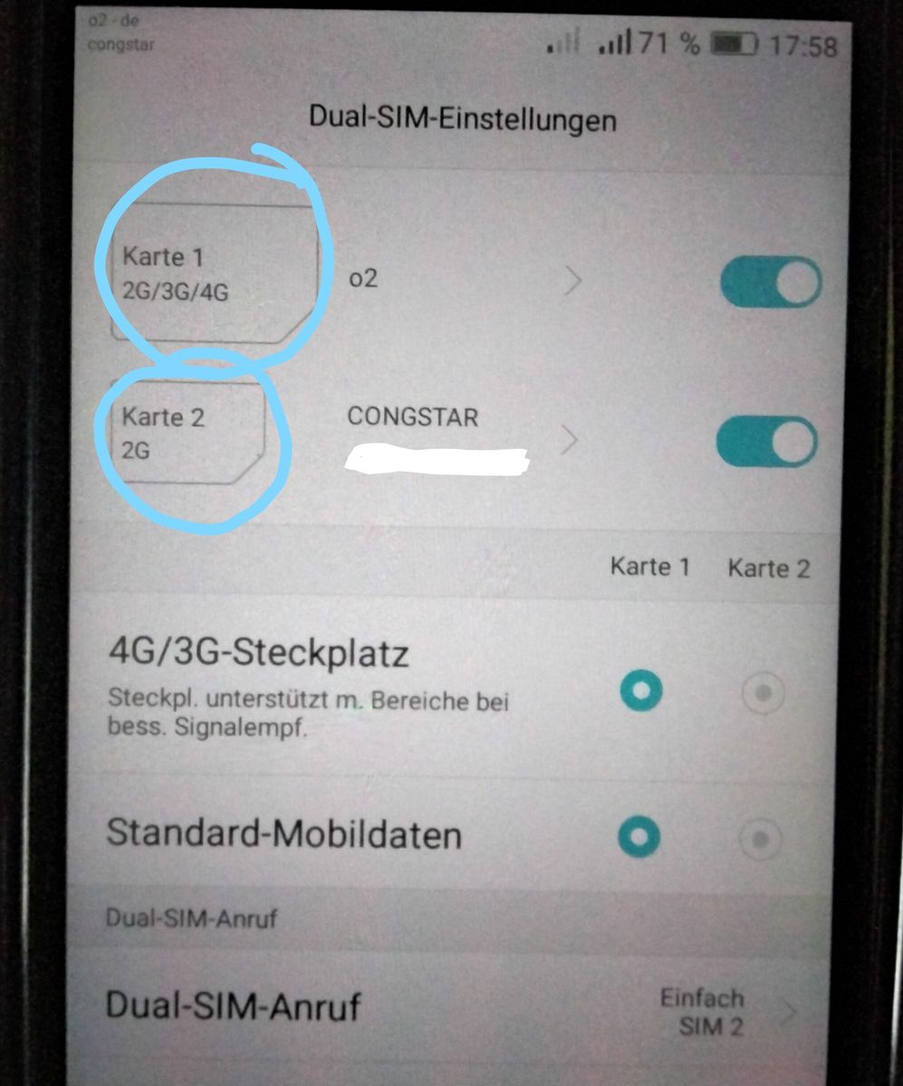 Aber was soll denn die Auswahloption drunter sein (s. Foto), Standard-Mobildaten??? Wenn 4G auf congstar SIM , aber Standrard-Mobildaten auf o2 SIM, dann ist sowieso kein Netz. Was bedeutet dieses "Standard-Mobildaten" bzw was soll die Wahl bewirken?